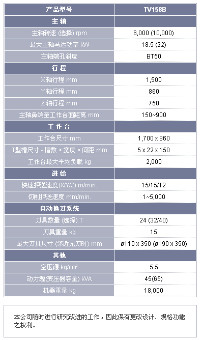 TV系列立式综合加工机,是专为高效率加工需求的产业所设计开发的专利结构工具机产品;广泛适用于大量生产之汽机车零件生产、航太及资讯电子产业之零组件加工,以及各类精密模具加工之生产。