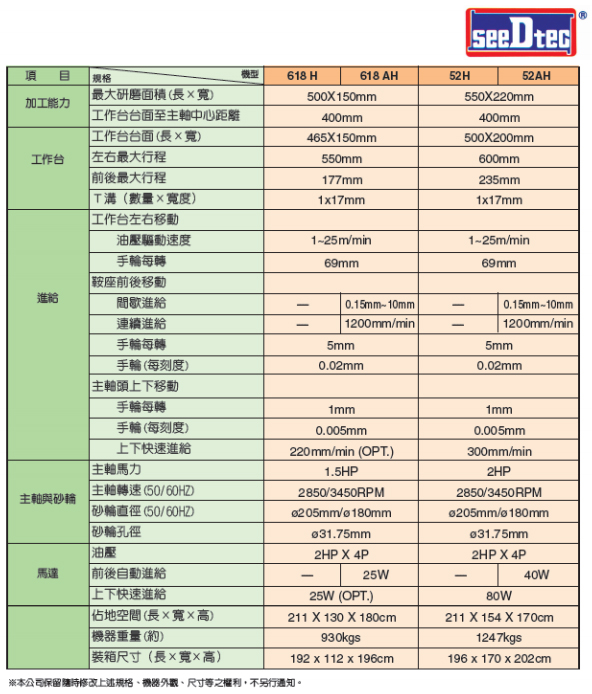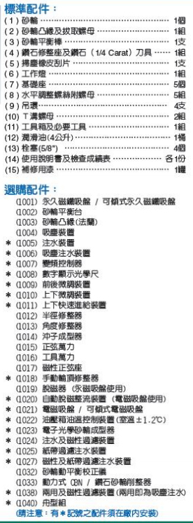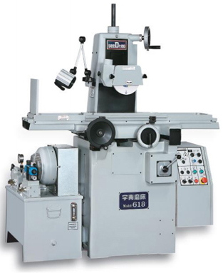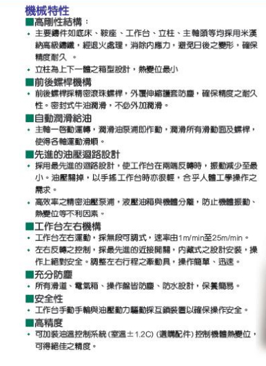 主要特點: ◆高剛性結構︰主要鑄件採用米漢納高級鑄鐵,經退火處理,消除內應力,避免日後之變形。 ◆前後螺桿機構︰前後螺桿採精密滾珠螺桿。 ◆自動潤滑給油︰主軸一啟動運轉,潤滑油幫浦即作動,潤滑所有滑動面及螺桿。 ◆先進的油壓系統︰工作台在兩端反轉時,振動減少至最小,低速時亦維持穩定之推力,可得較佳之研磨面。 ◆工作台左右機構︰工作台左右油壓運動,採無段可調式,速率由1m/min至25m/min;左右反轉之控制,採近接開關無機械式之噪音。
