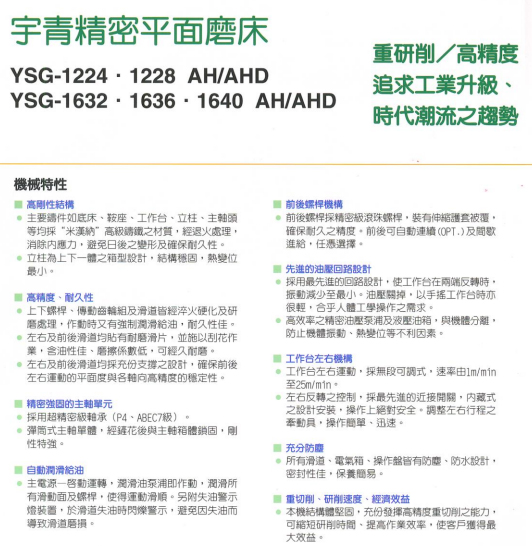 ◆先進的油壓系統︰工作台在兩端反轉時,振動減少至最小,低速時亦維持穩定之推力,可得較佳之研磨面。